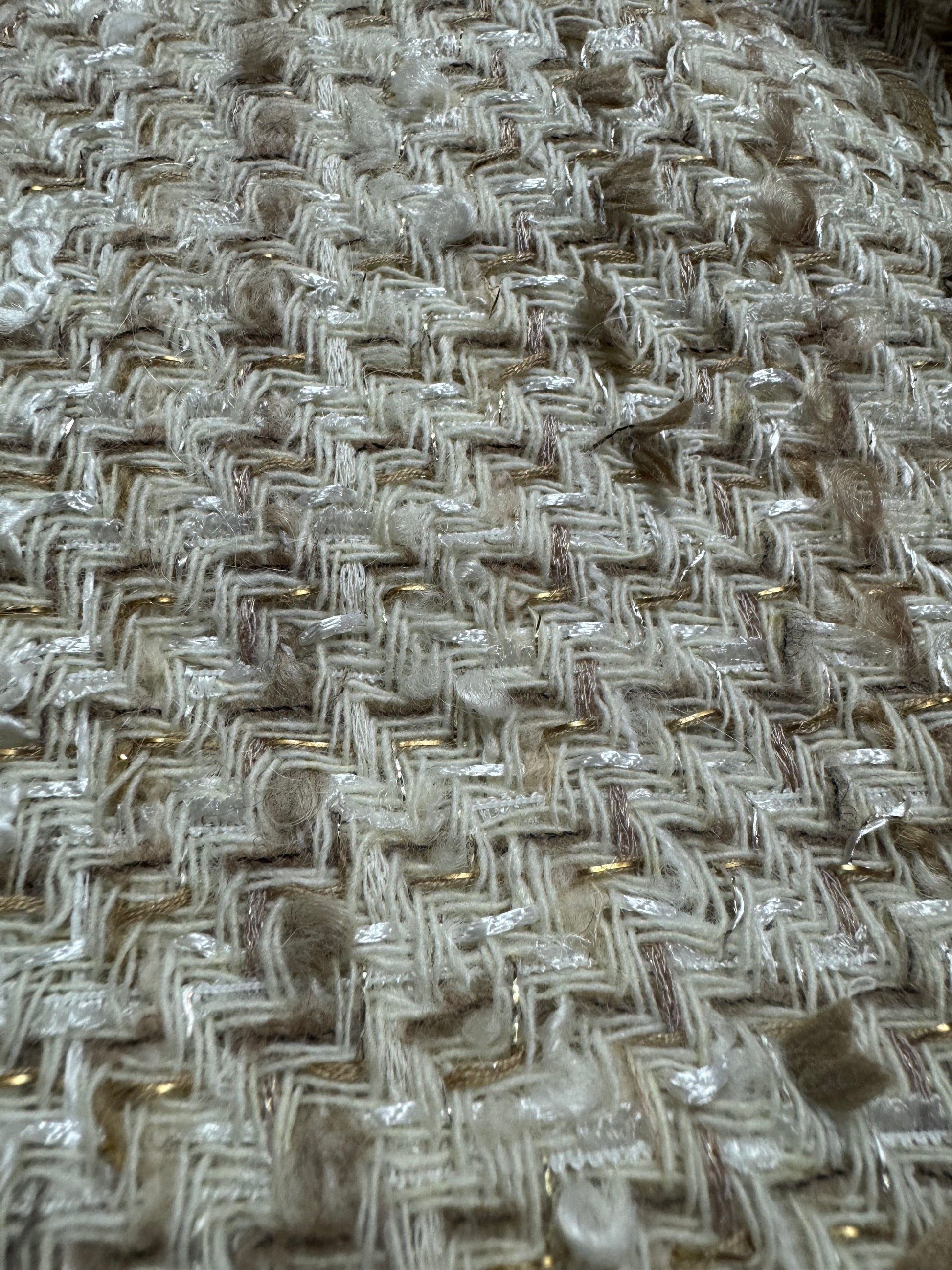 The composition of this fabric is wool, cotton and fine metallic thread woven throughout this herringbone pattern. This oversized piece measuring 150cm wide and 300cm long is not only perfect for styling but also functional.
